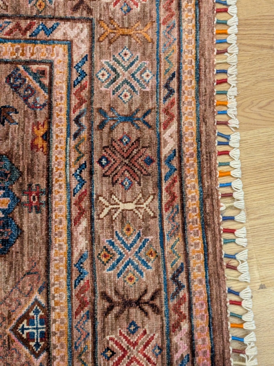 • Un motif emblématique : Les médaillons aux formes angulaires, répartis avec rigueur, racontent l’héritage culturel afghan dans toute sa splendeur.