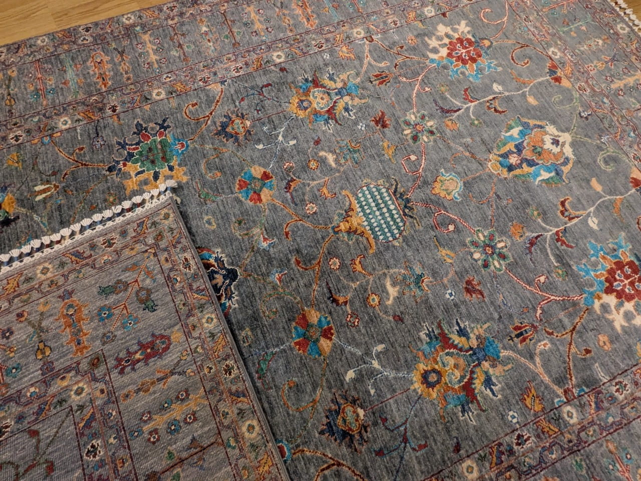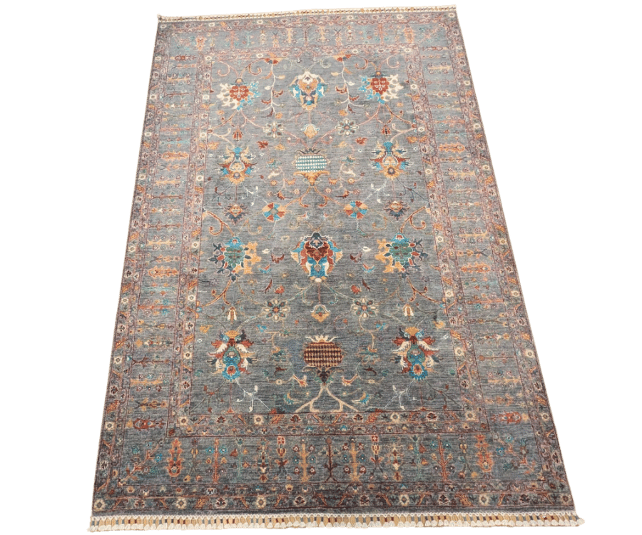 Ce tapis Saray noué à la main en Afghanistan se distingue par son fond bleu-gris légèrement patiné et ses motifs floraux raffinés. Le décor mêle des fleurs stylisées et des arabesques aériennes dans une palette douce de beige, rouge, vert et turquoise, évoquant l’élégance des grands tapis persans tout en apportant une touche plus actuelle et délicate grâce à sa finition subtilement vieillie.