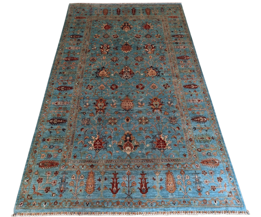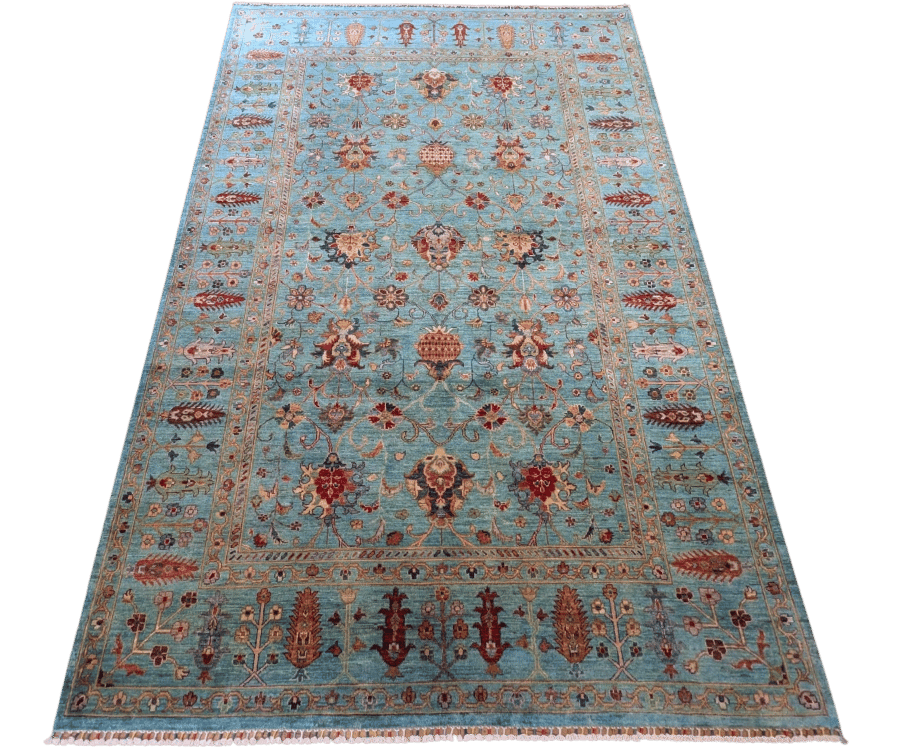 Ce tapis Saray noué à la main en Afghanistan se distingue par son fond bleu lumineux, mis en valeur par des motifs floraux délicatement répartis. Inspiré des grands classiques Ziegler, il séduit par sa finesse d’exécution et sa palette rafraîchissante, offrant à tout intérieur une touche d’élégance discrète et aérienne.