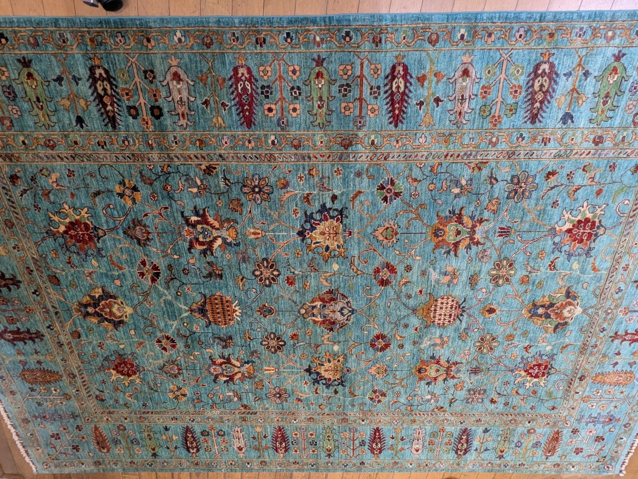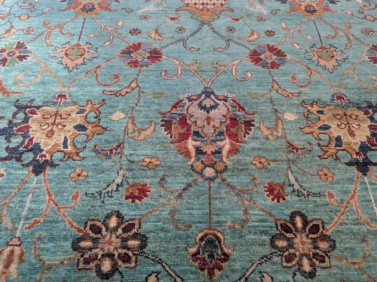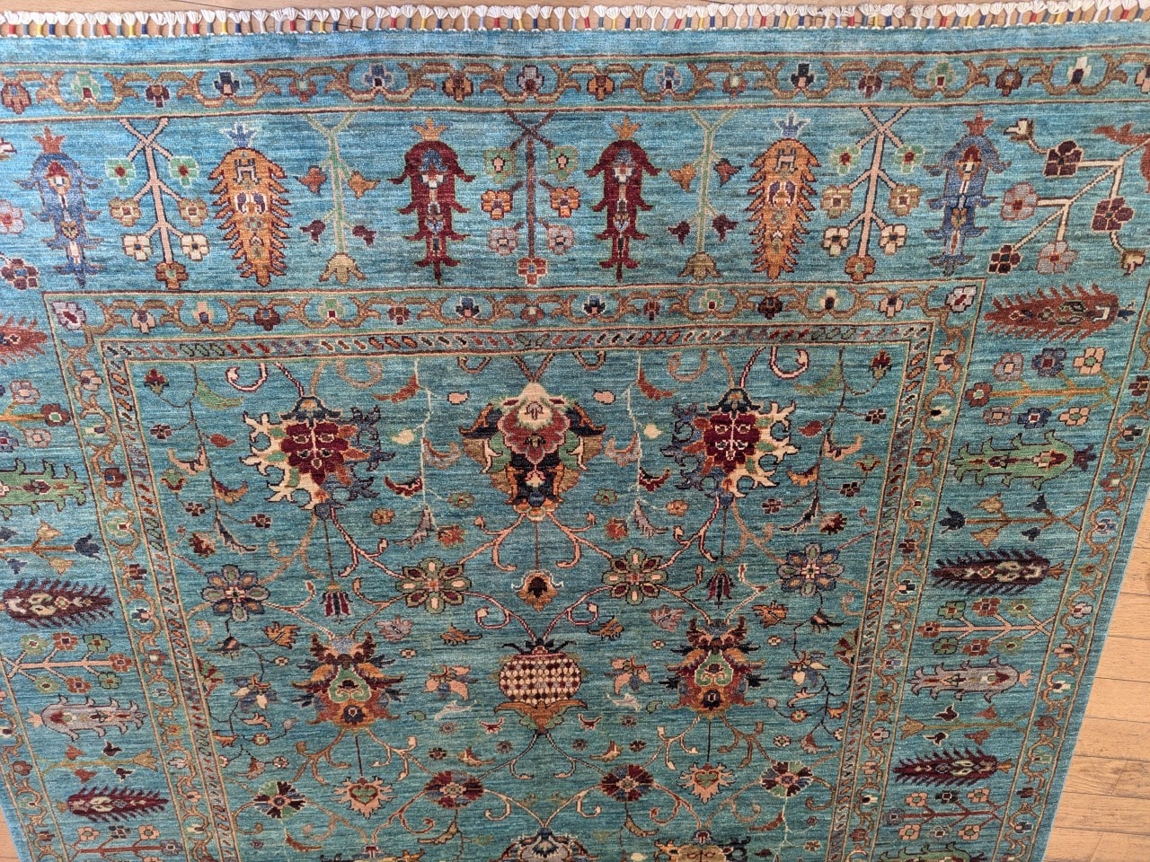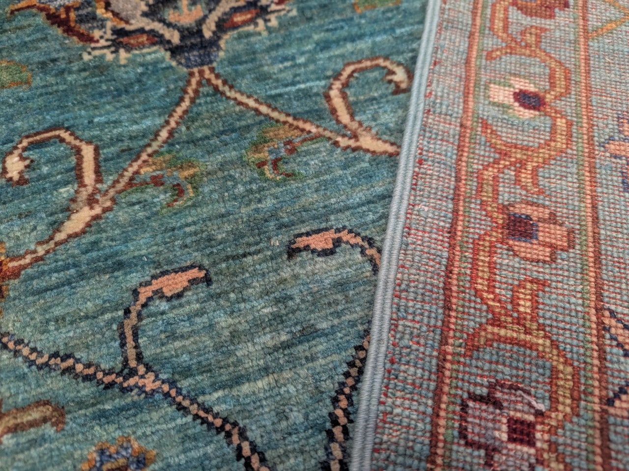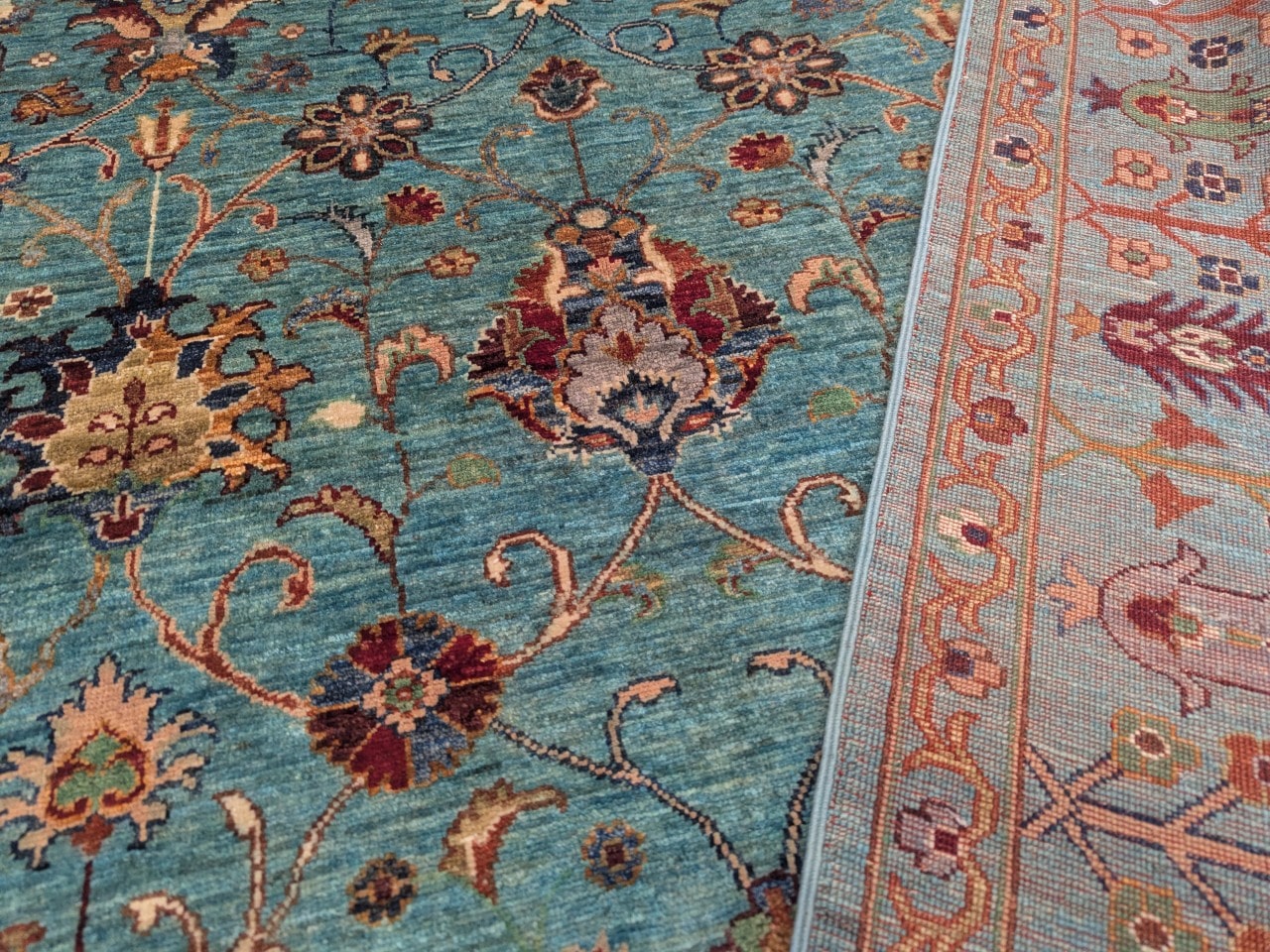 Une douceur visuelle rare : Sa dominante bleu clair, associée à des touches ivoire et brique, confère au tapis une ambiance apaisante et raffinée.