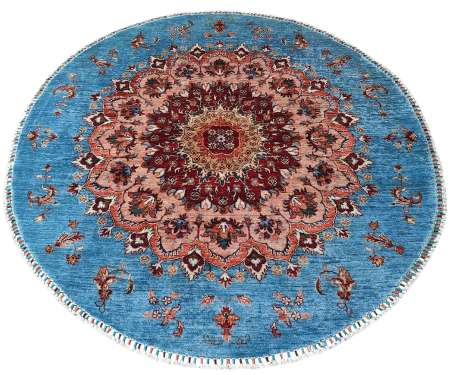 Ce tapis rond Saray d’Afghanistan séduit par son fond bleu lumineux qui apporte fraîcheur et élégance à l’ensemble. Au centre, un large médaillon floral richement détaillé se déploie en rosace, mêlant des nuances de rouge, ivoire et beige. La composition circulaire accentue l’effet harmonieux et enveloppant du motif.