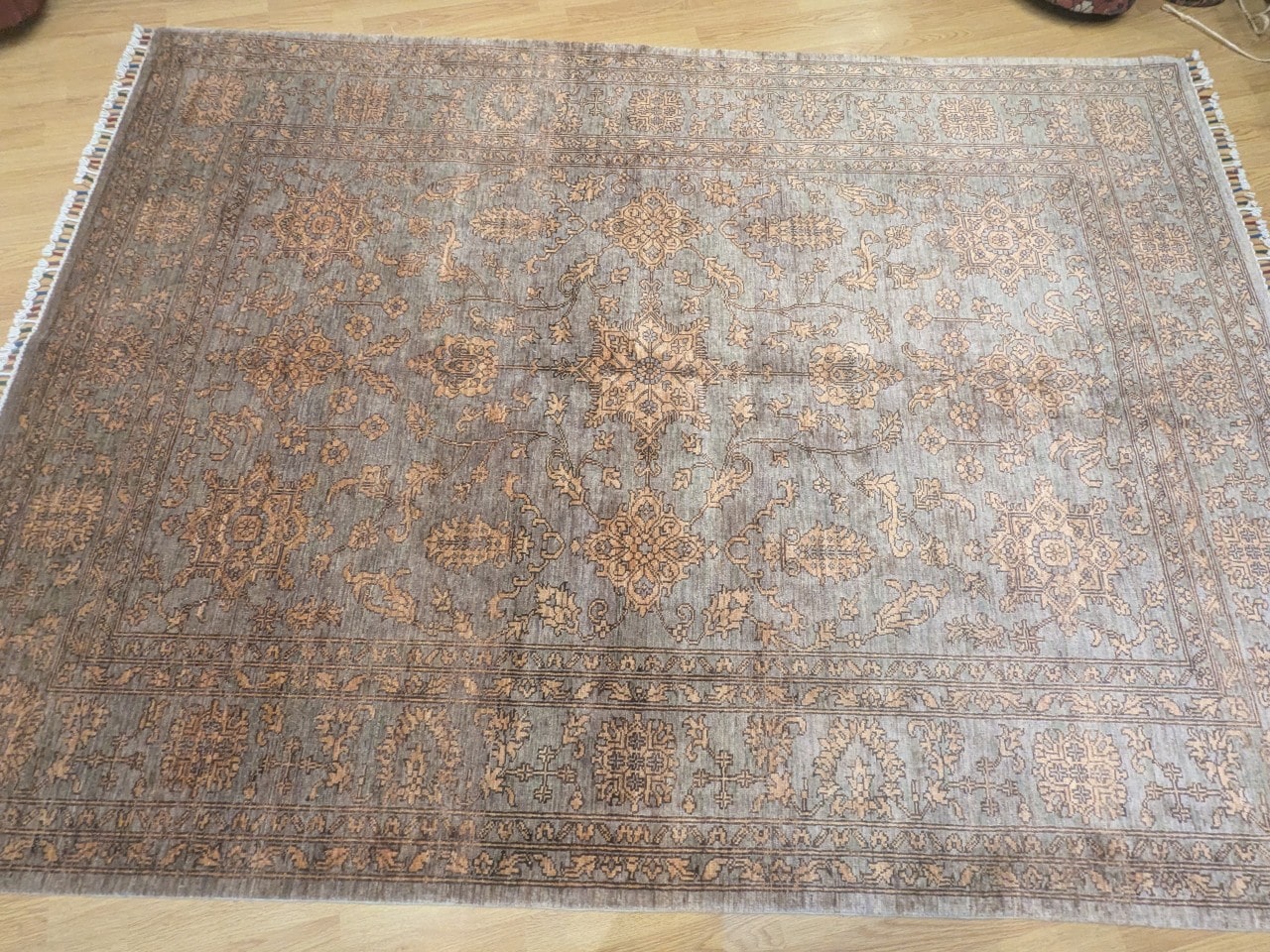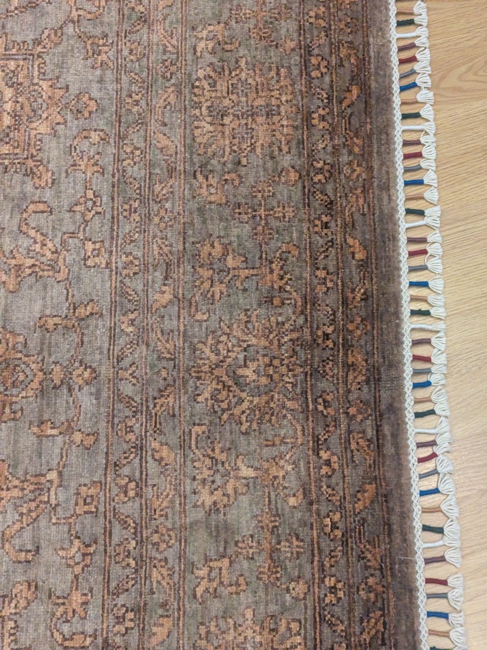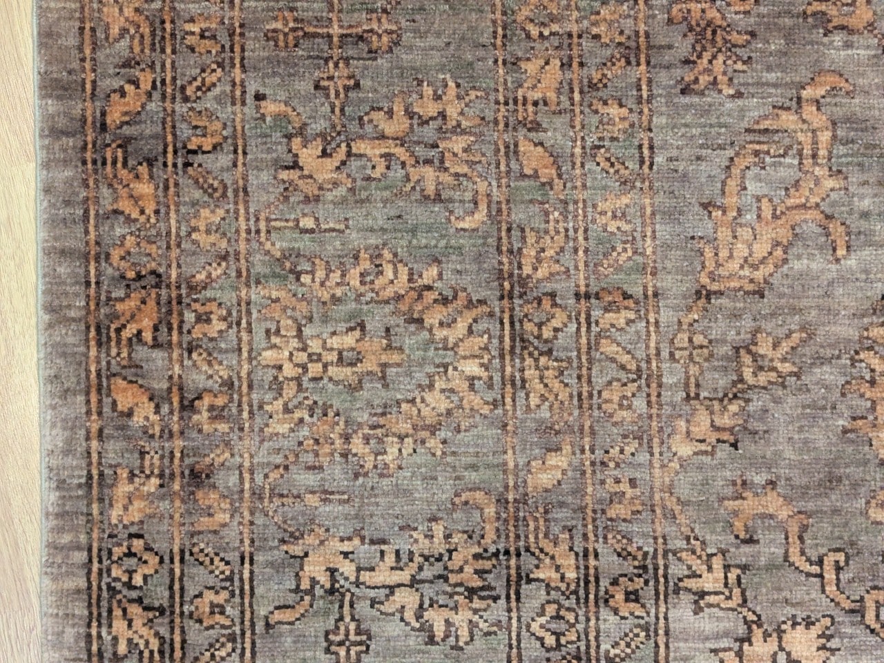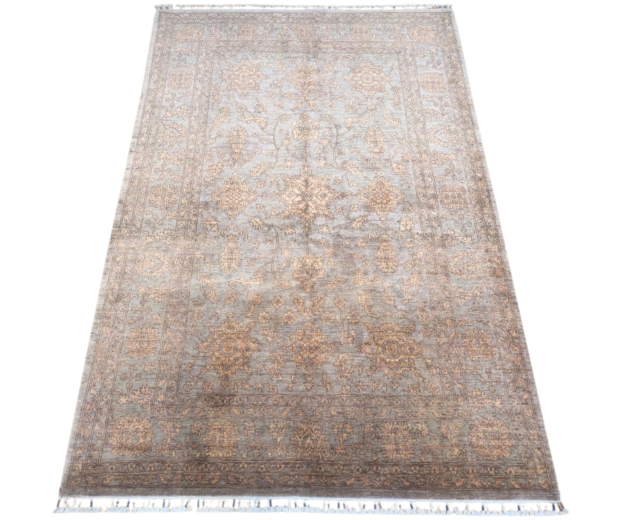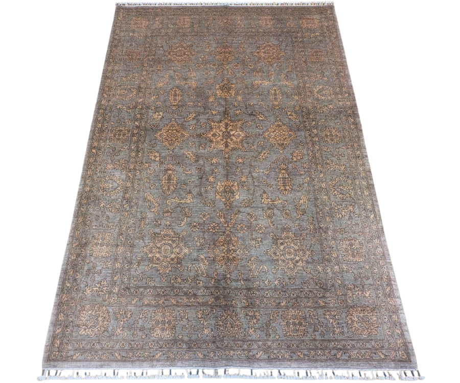 Ce tapis Saray au fond gris taupe illustre parfaitement l’élégance des pièces afghanes vintage. Son apparence légèrement usée et ses motifs floraux ton sur ton créent un effet faux-uni discret, presque fondu dans la matière. Le contraste doux entre la laine grisée et les ornements beiges confère à ce tapis un charme suranné, comme patiné par le temps, idéal pour une décoration chic et authentique.