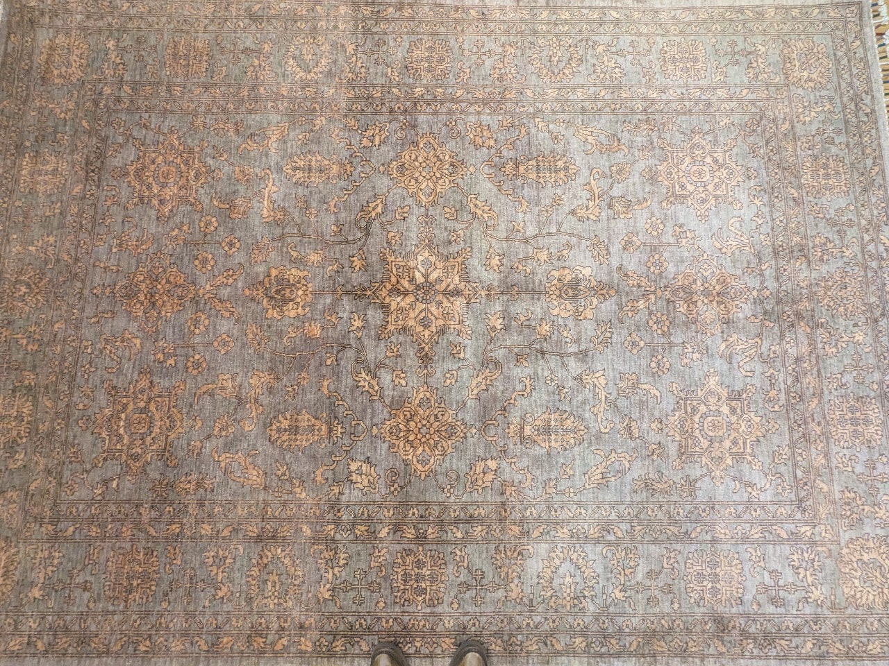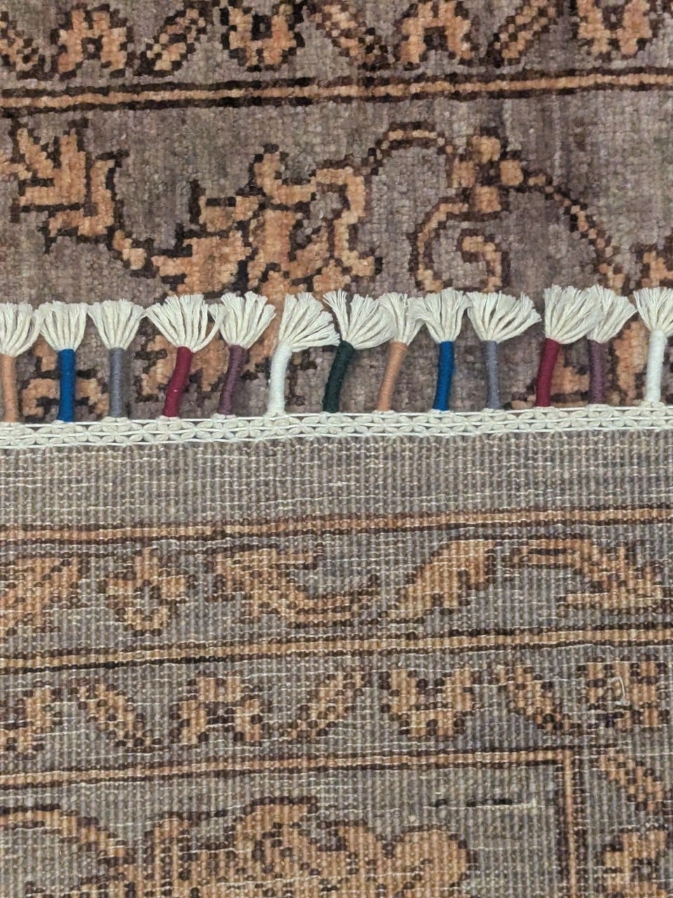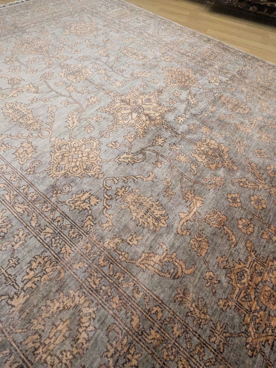 Une texture pleine de caractère : Le travail de finition donne un effet vieilli maîtrisé qui accentue l’authenticité artisanale du tapis.