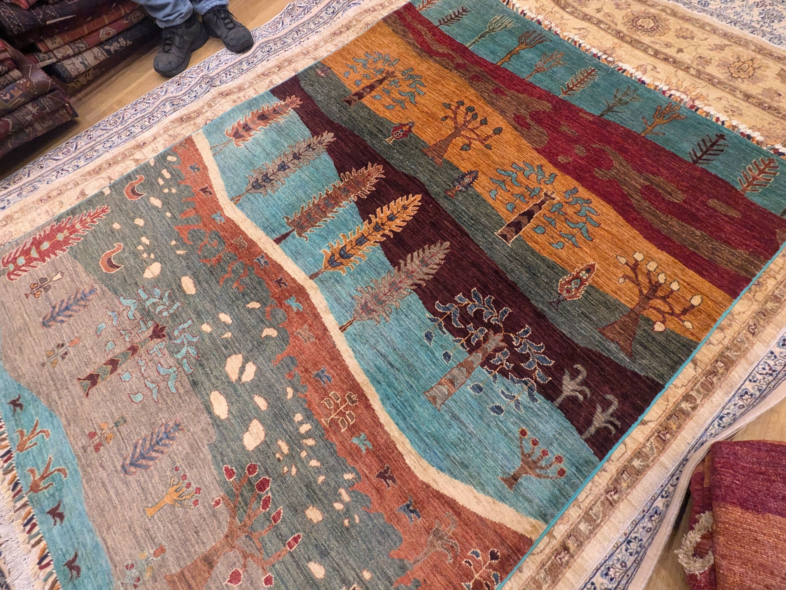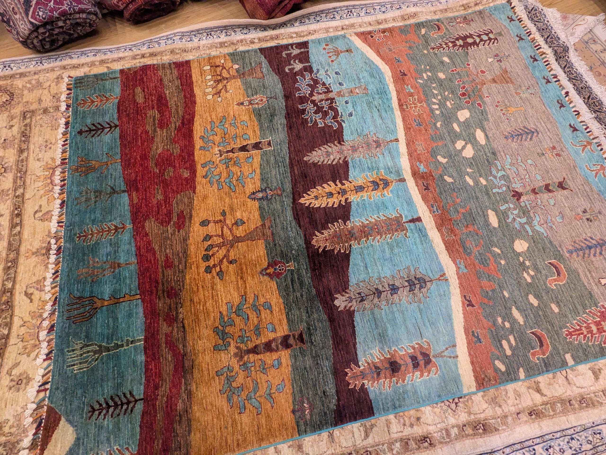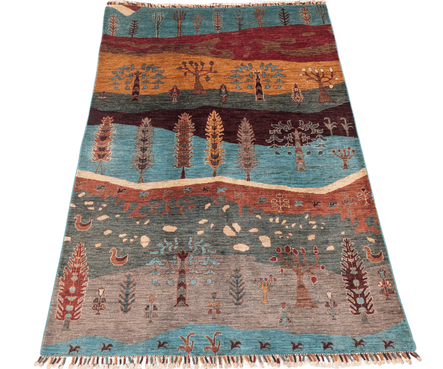 Ce tapis Saray originaire d’Afghanistan se distingue par son motif narratif inspiré de la nature et des paysages. Composé de larges bandes horizontales aux teintes bleu turquoise, ocre, brun et terracotta, il évoque un panorama stylisé où se succèdent arbres, plantes et petits symboles décoratifs.