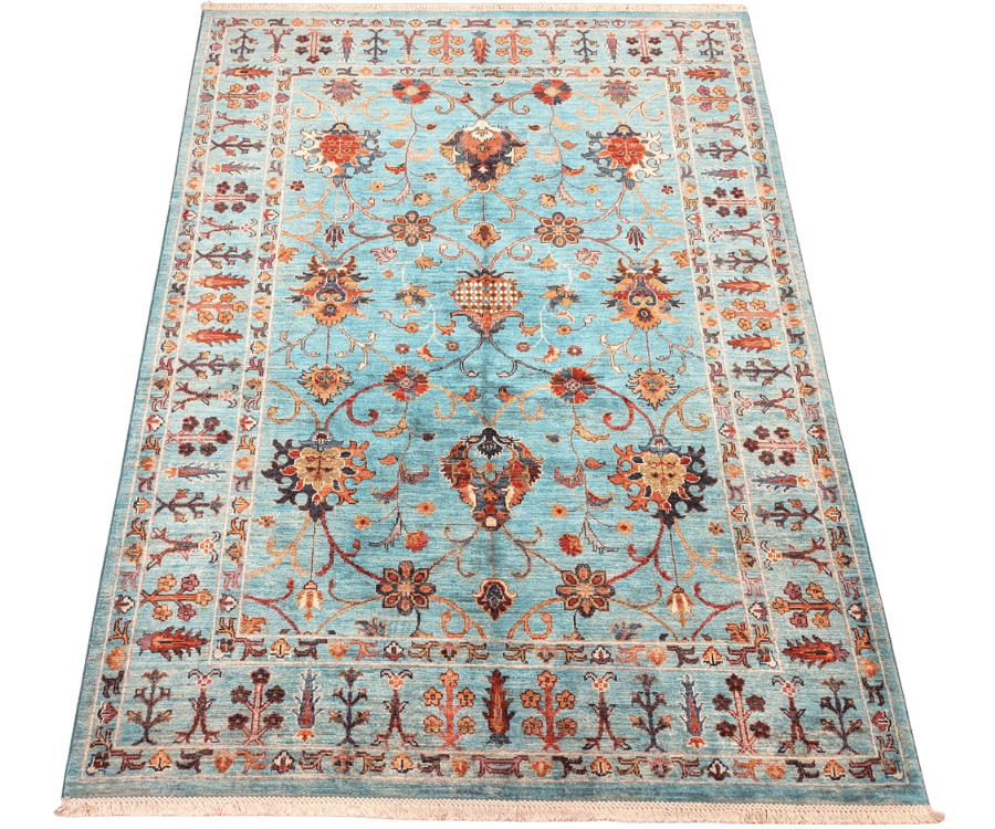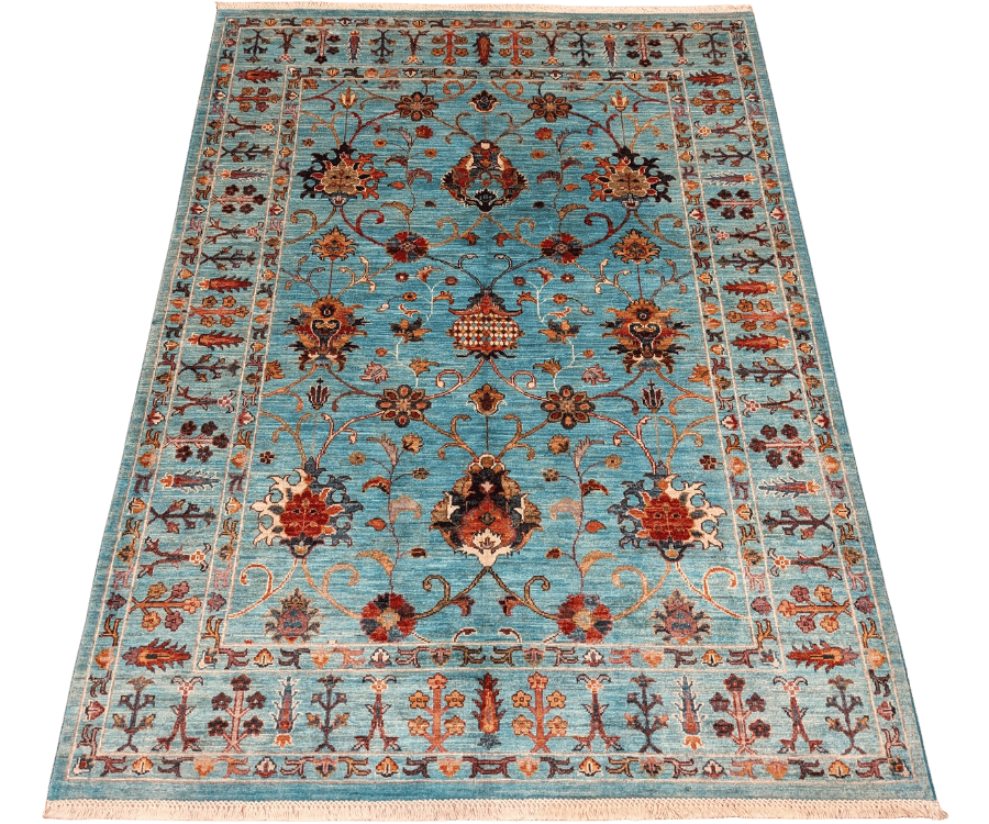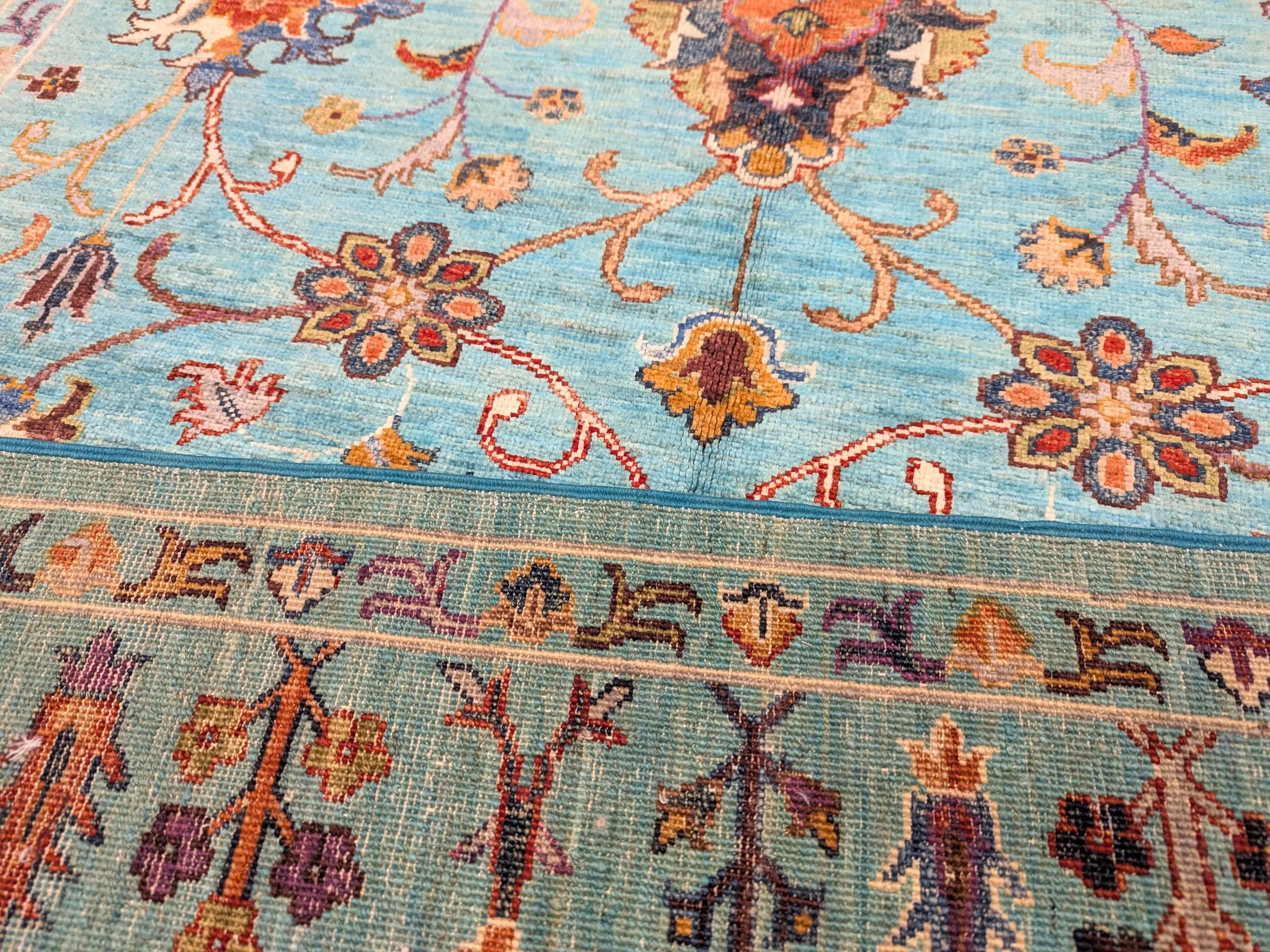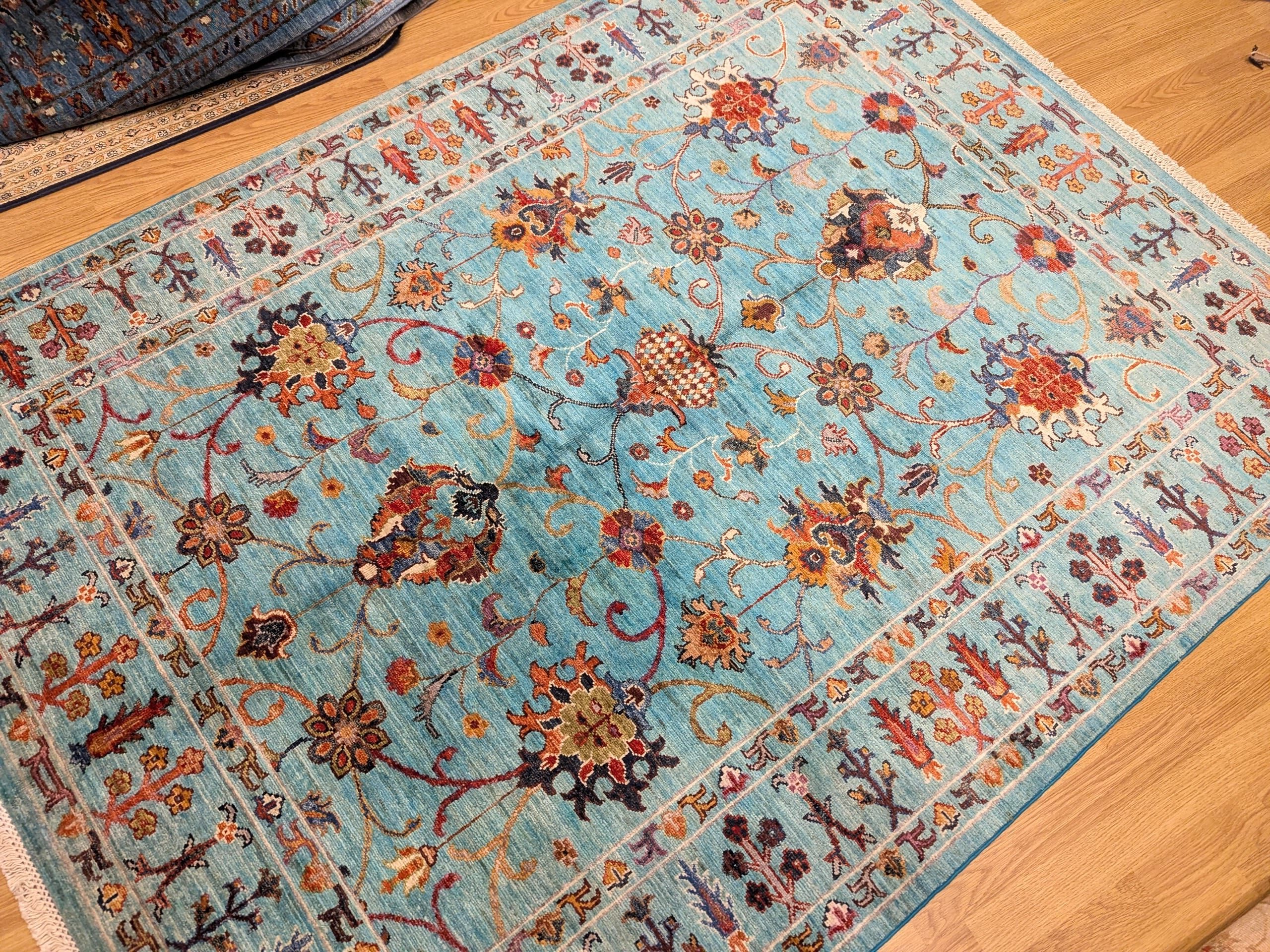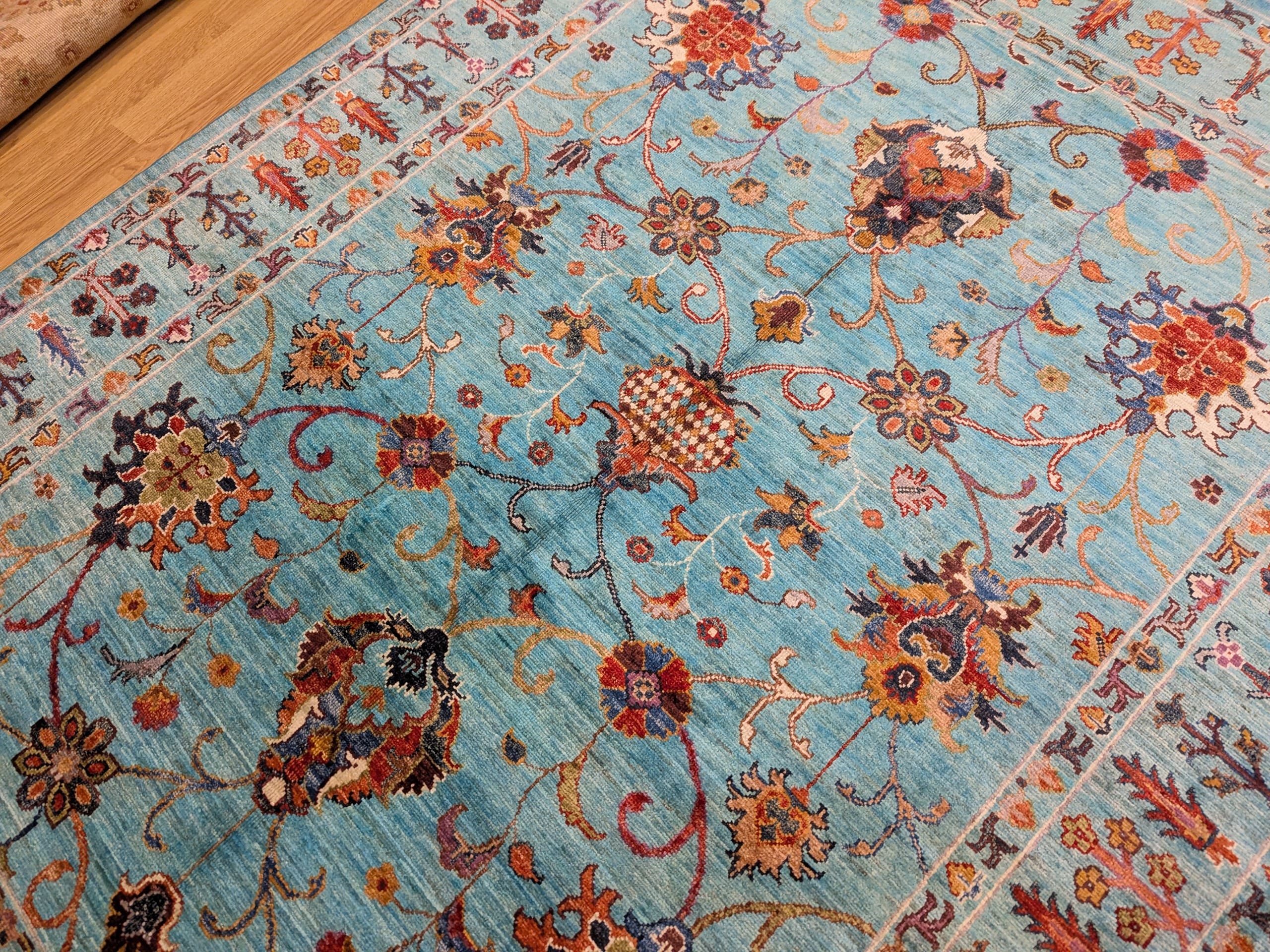 Ce tapis Saray venu d’Afghanistan est un modèle d’élégance classique revisité avec fraîcheur. Sa teinte bleu clair dominante et ses motifs floraux finement noués à la main offrent une interprétation lumineuse des grands classiques persans. Idéal pour illuminer un intérieur, il mêle douceur visuelle et raffinement décoratif.