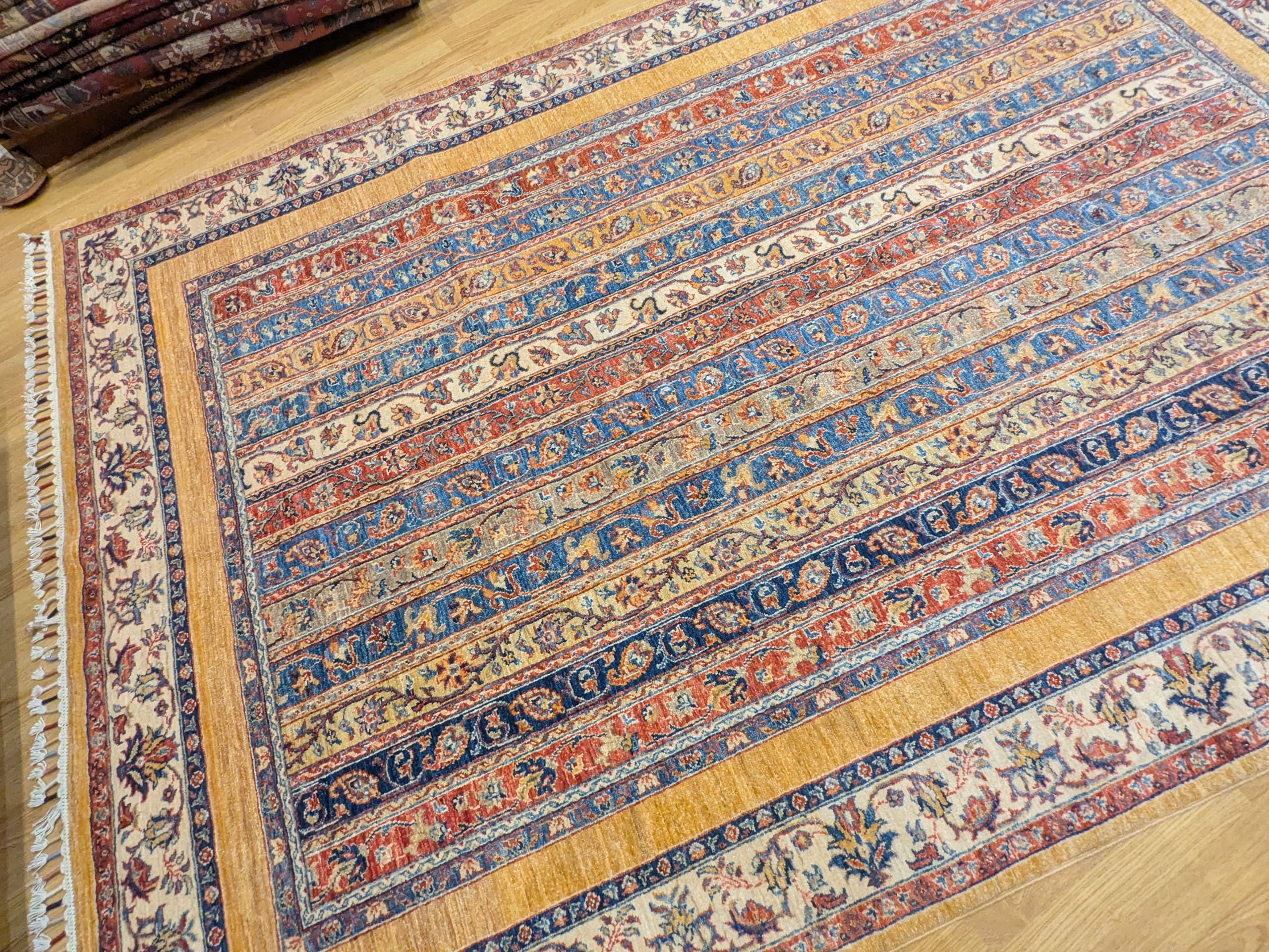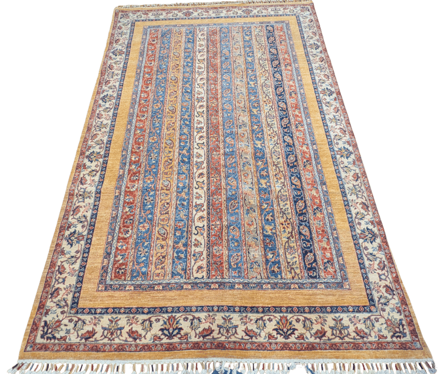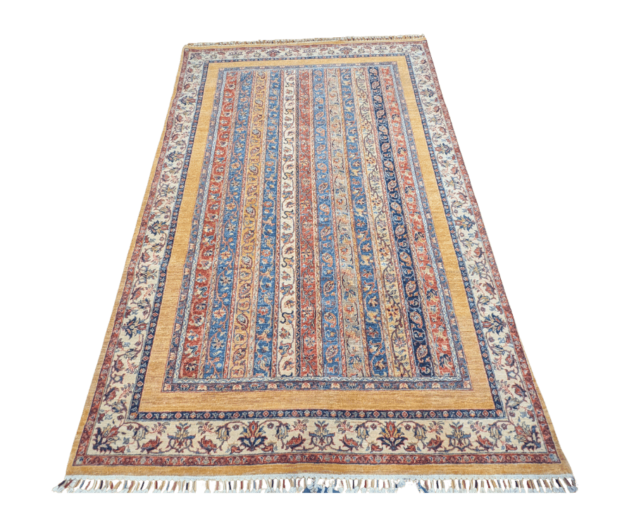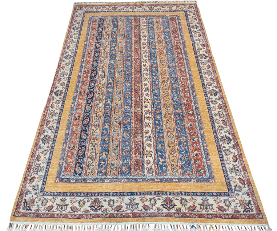 Ce tapis Shal d’Afghanistan se distingue par son décor original composé de bandes verticales richement ornées. Chaque bande présente des motifs floraux stylisés et des arabesques traditionnelles, créant un rythme décoratif raffiné qui structure l’ensemble du tapis.