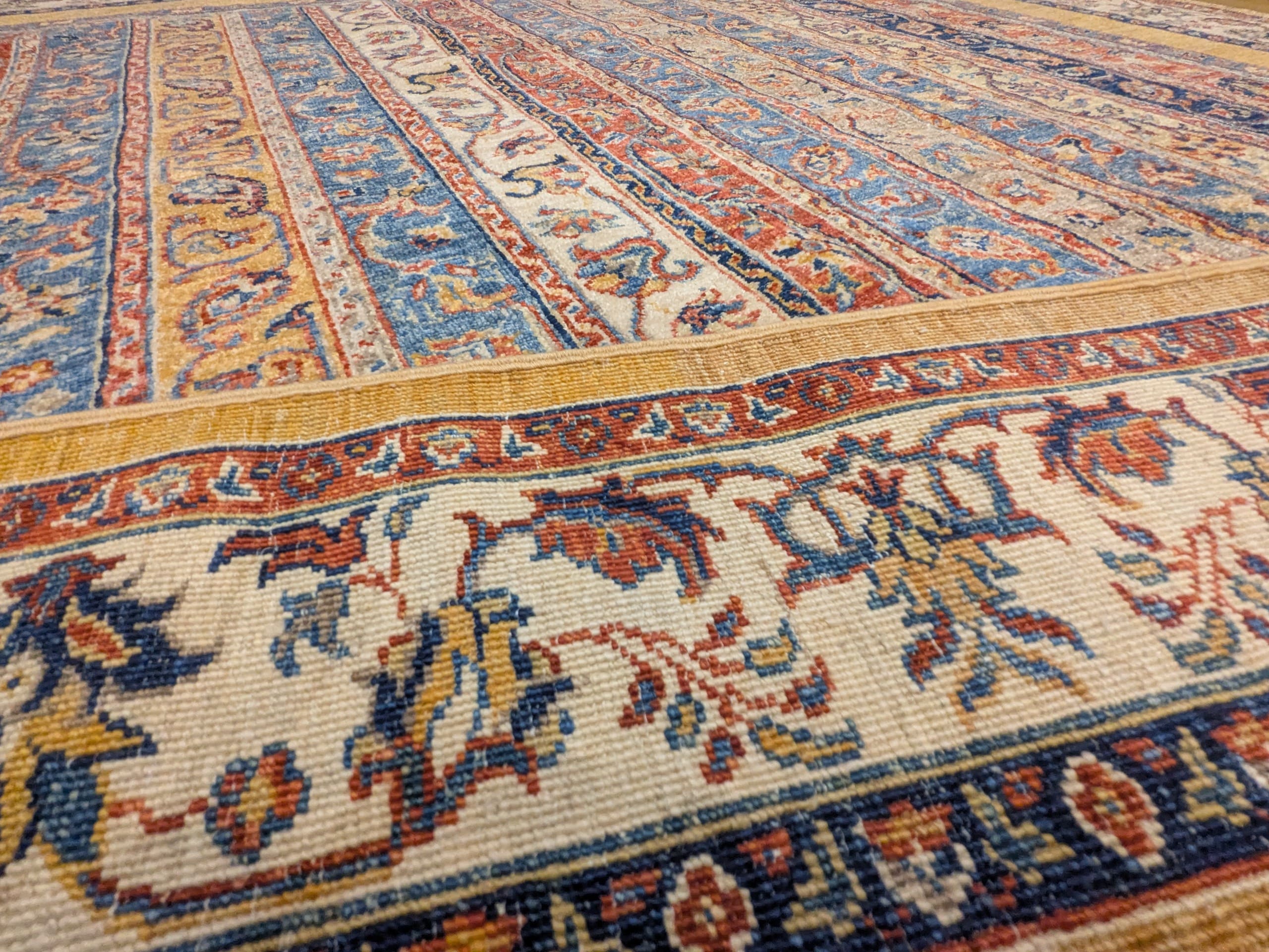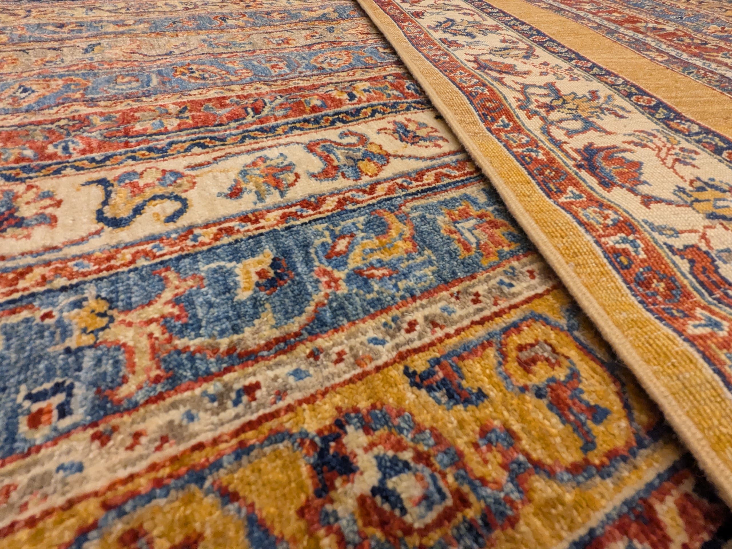 La palette associe harmonieusement bleu, ivoire, ocre et terracotta, des teintes douces qui apportent à la fois luminosité et chaleur. La bordure florale claire encadre l’ensemble avec élégance et met en valeur la composition centrale. Noué à la main en laine, ce tapis offre à la fois souplesse, résistance et richesse décorative.