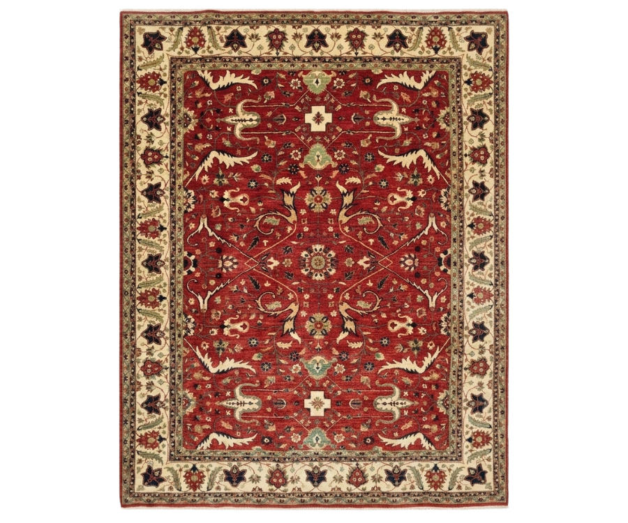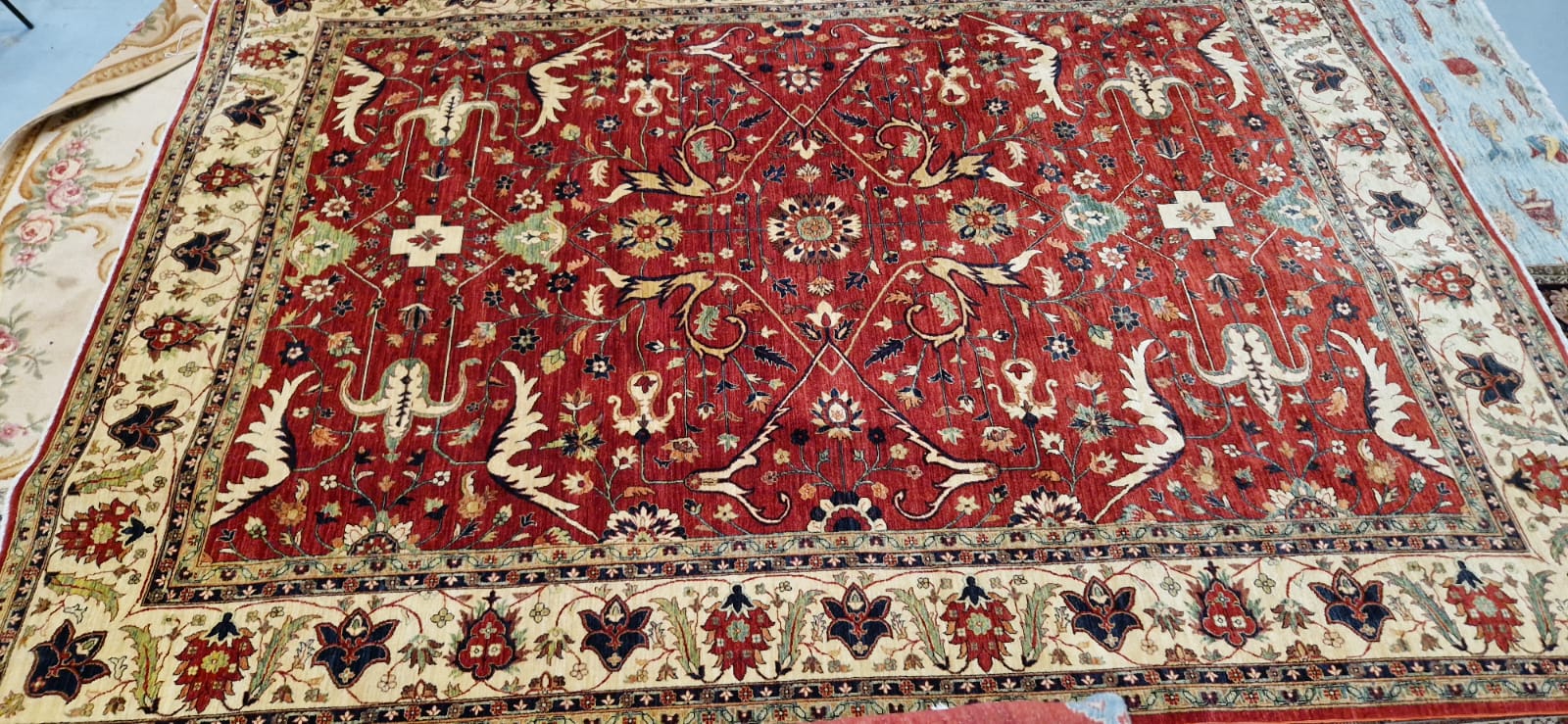 Ce tapis Ziegler d’Afghanistan se distingue par son fond rouge profond qui met en valeur une composition riche de motifs floraux et figuratifs inspirés des grandes traditions décoratives persanes. Le décor est structuré avec finesse, mêlant fleurs stylisées, arabesques et silhouettes animales qui s’entrelacent harmonieusement. La large bordure ivoire, décorée de motifs floraux colorés, crée un contraste élégant qui encadre la composition et apporte de la lumière à l’ensemble.