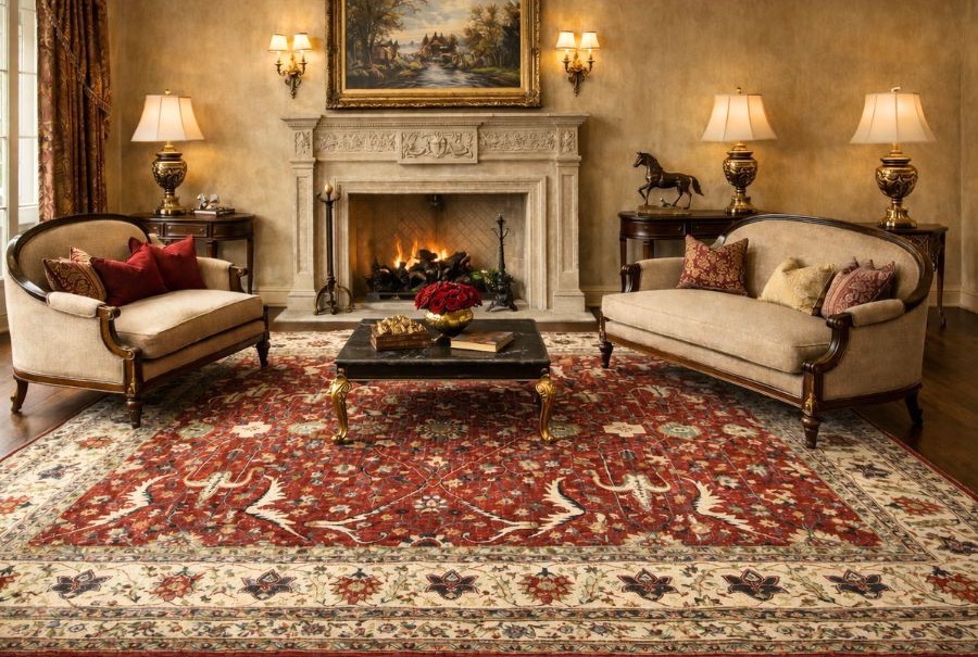 • Un grand salon : Placé sous un large canapé ou au centre d’un espace de réception, il apporte chaleur et élégance à la pièce.