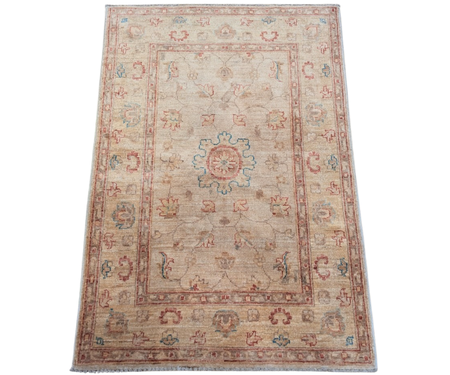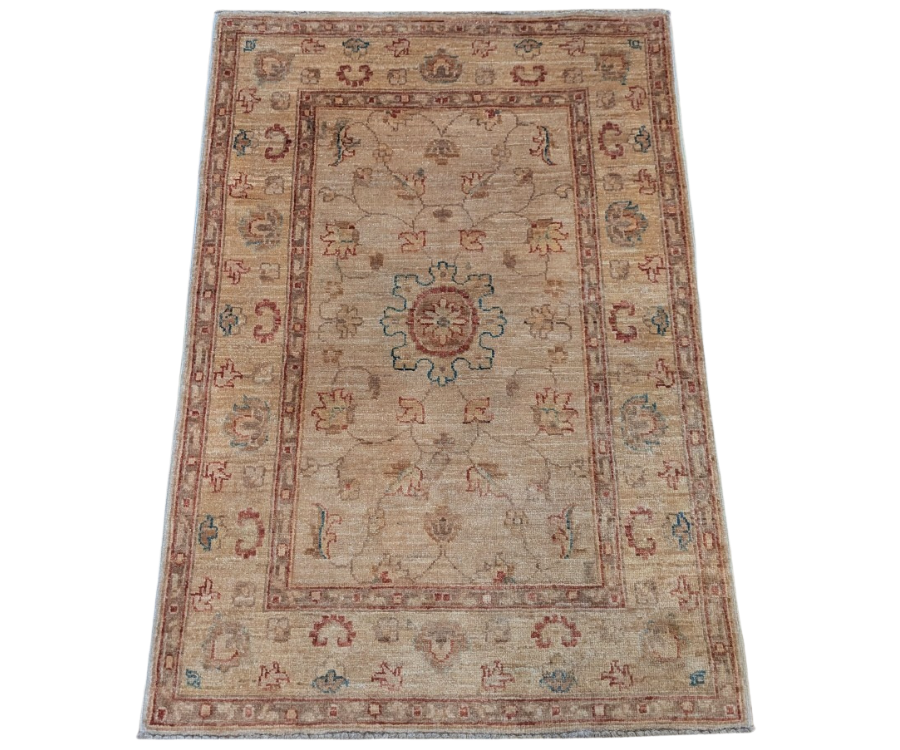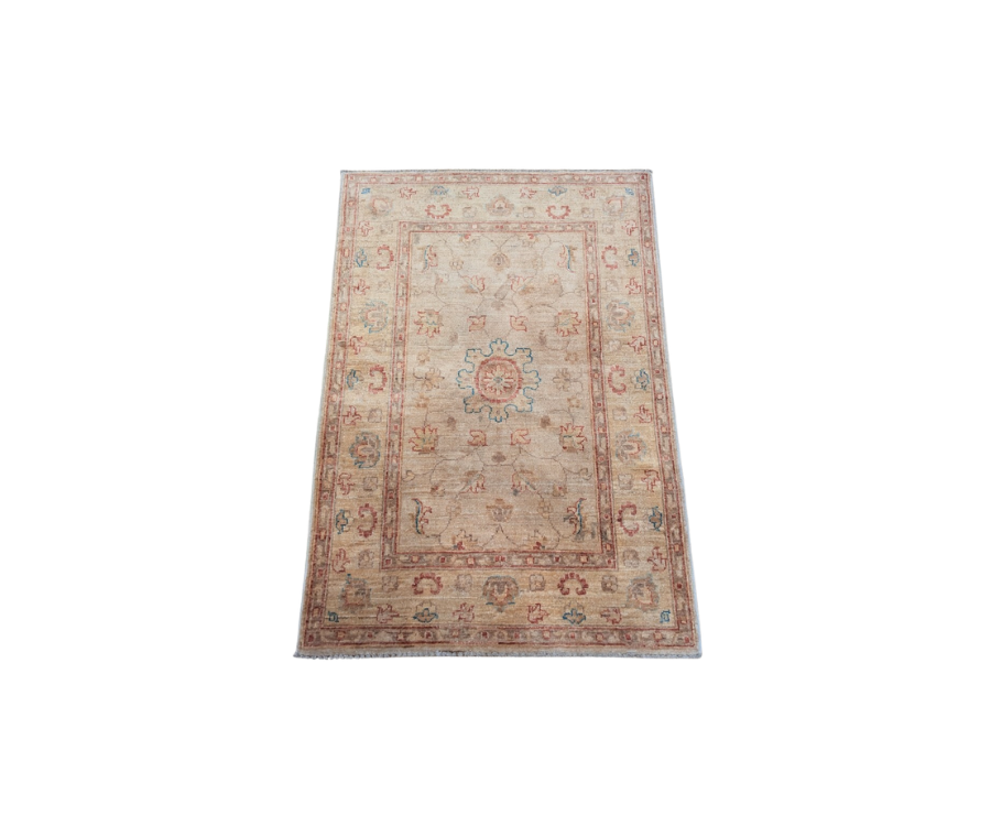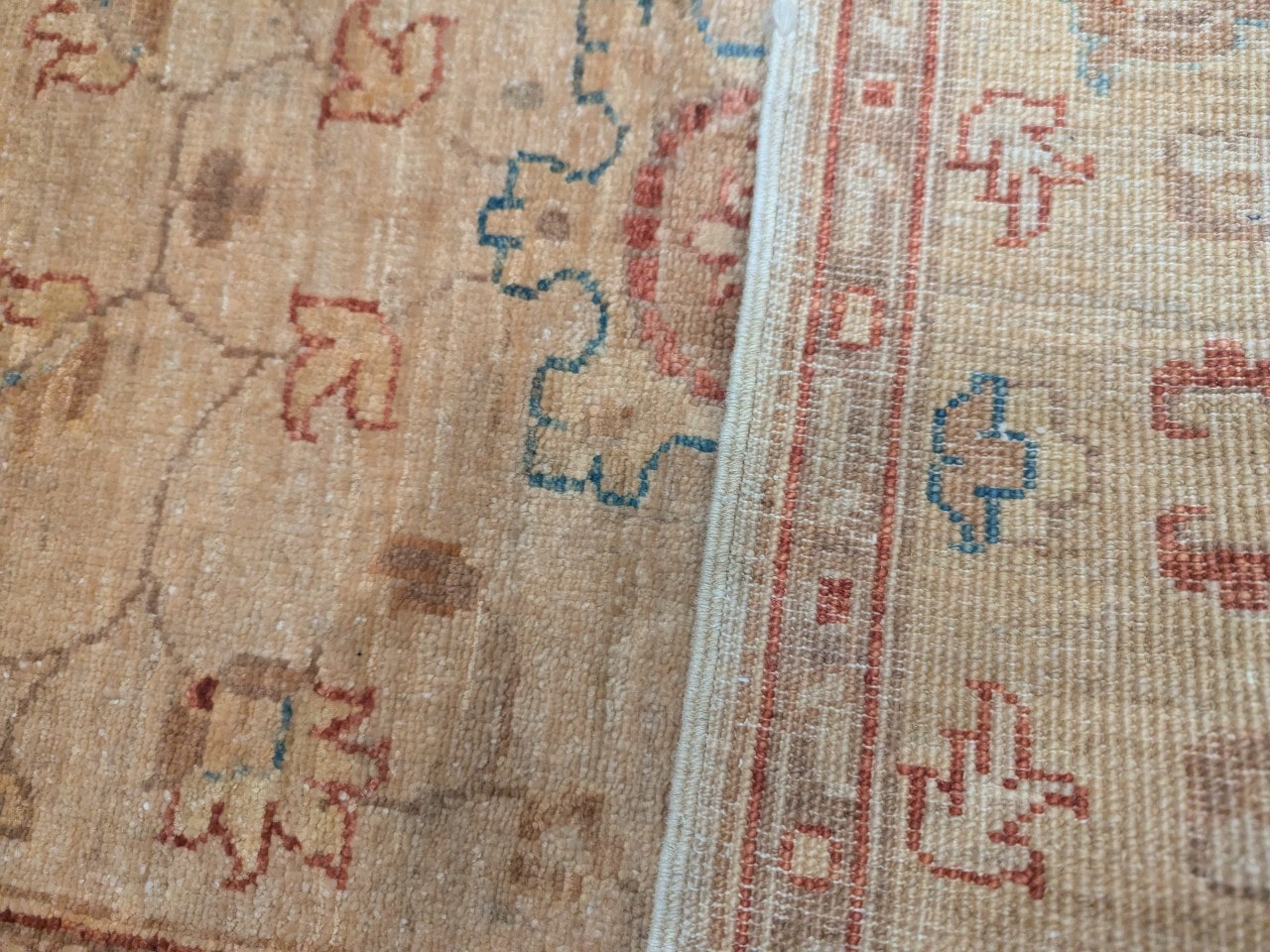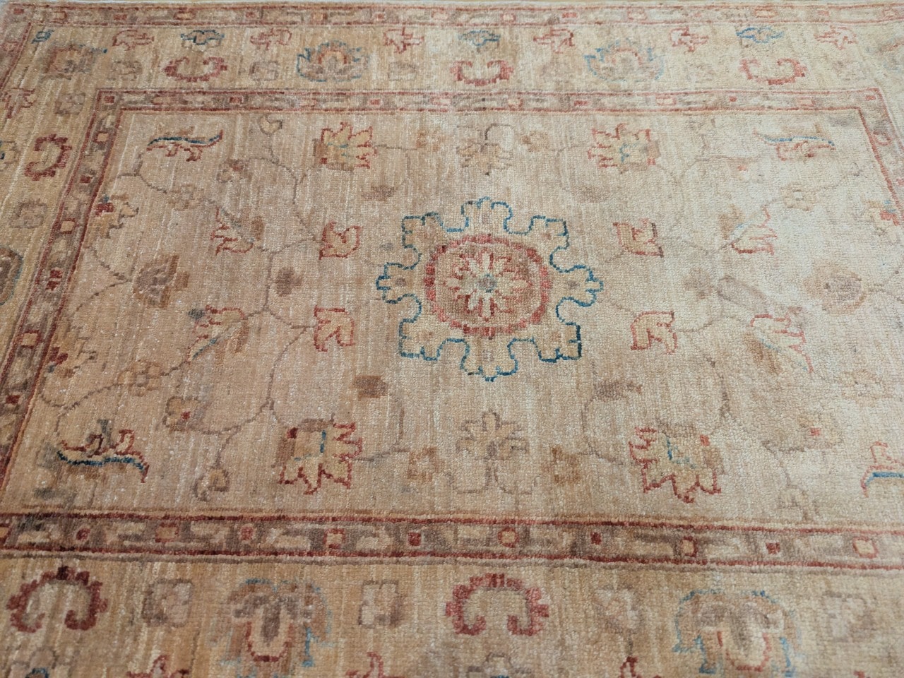 Ce tapis Ziegler, noué à la main en Afghanistan, séduit par son charme patiné et sa palette de tons doux. Son fond beige délicat met en valeur un médaillon central discret entouré de motifs floraux épurés, dans un style typique des productions Ziegler. Le travail volontairement vieilli de la texture lui confère un aspect authentique et chaleureux.