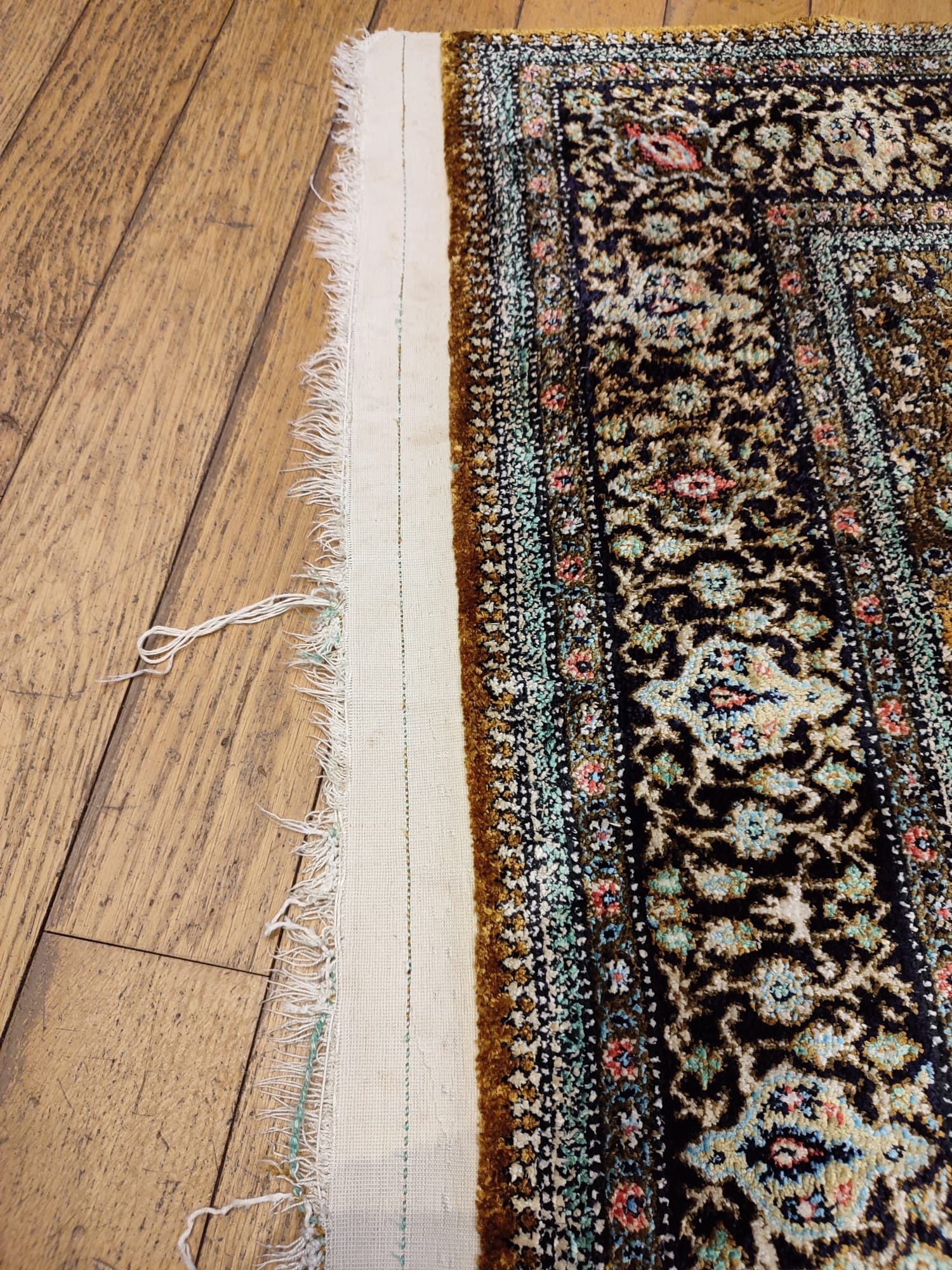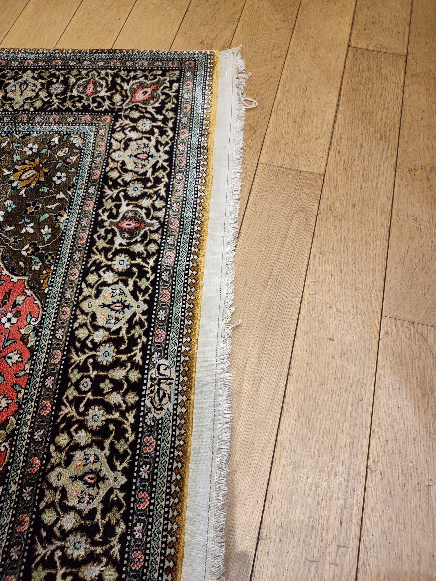 Ce tapis Ghoum en soie, pièce de prestige de l’artisanat persan, présentait des signes d’usure au niveau de ses extrémités. Pour préserver sa structure et prolonger sa durée de vie, nous avons réalisé deux nouveaux points d’arrêt après avoir sorti délicatement les fils de trame en soie d’origine.
