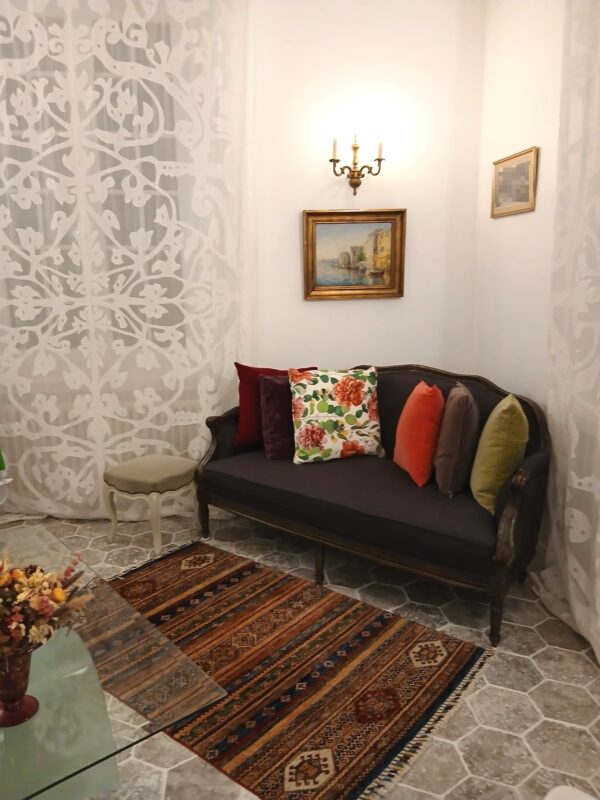 Dans ce coin salon à l’esprit classique, entre rideaux délicatement travaillés et mobilier ancien, il fallait une pièce capable d’apporter du relief sans rompre l’harmonie du lieu. Le format allongé de ce tapis issu de notre collection de Khorjin s’intègre naturellement devant la banquette, structurant subtilement l’espace.