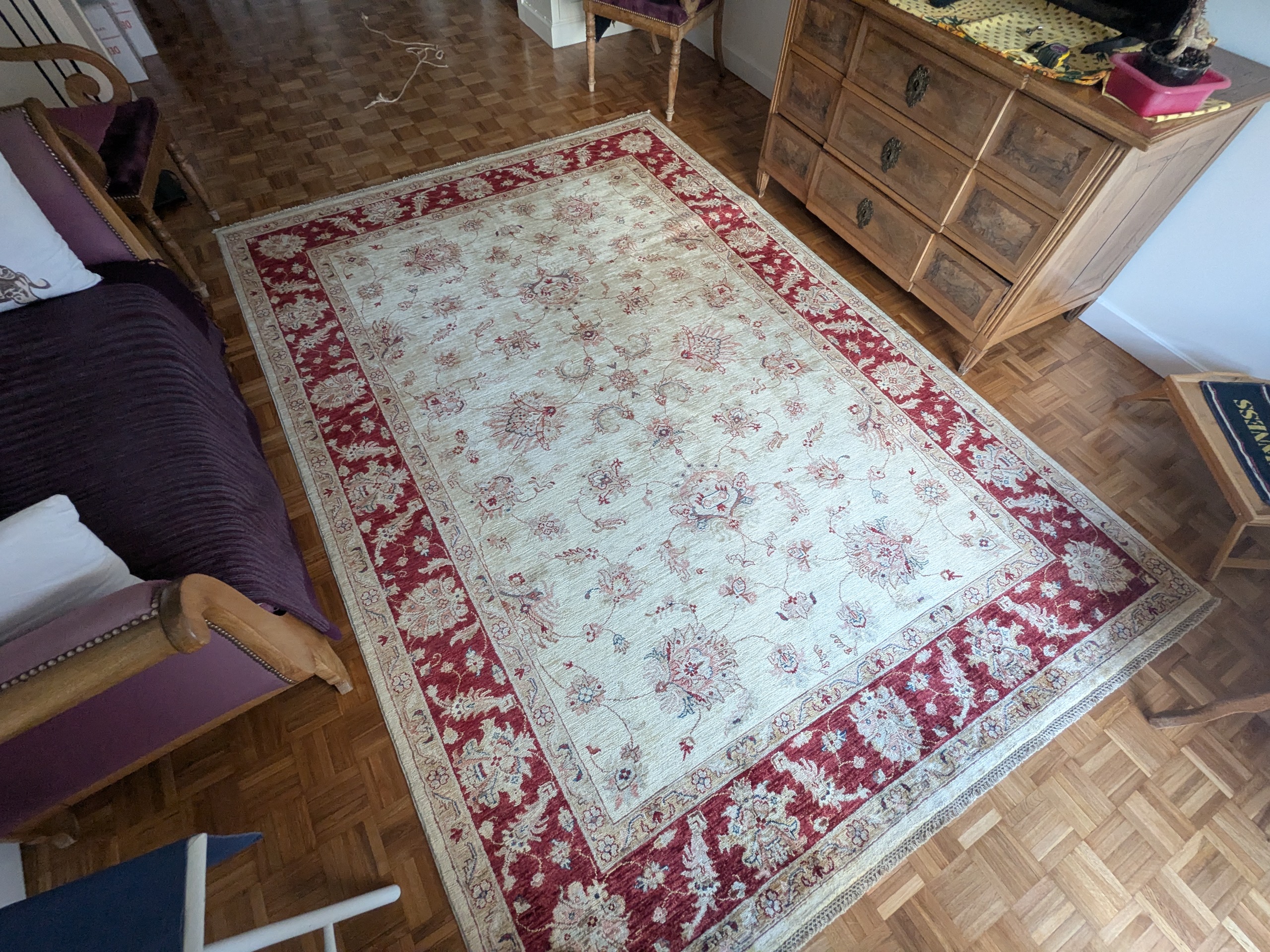Notre cliente cherchait un tapis qui réchauffe son salon parisien tout en conservant une belle légèreté visuelle. L’objectif était clair : trouver une pièce qui dialogue avec les moulures, le parquet ancien et un mobilier contemporain sans étouffer l’espace. Après quelques échanges et une sélection resserrée au sein de notre collection, c’est un tapis Ziegler qui a su s’imposer comme une évidence. Son dessin floral classique, aux lignes douces et équilibrées, apporte une touche de raffinement sans excès. Les tons subtils de beige, de crème et de brique créent une harmonie naturelle avec la lumière du lieu et les matériaux nobles déjà présents dans l’appartement. Noué main, ce tapis en laine incarne une élégance discrète, ancrée dans la tradition orientale tout en s’intégrant parfaitement à un intérieur parisien classique.
