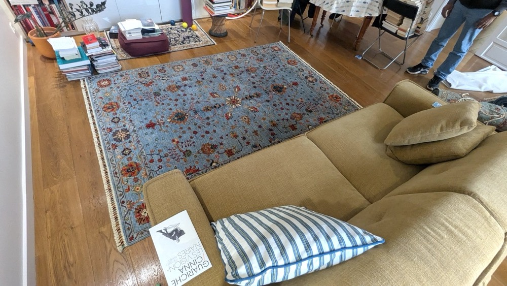 Sa laine douce, ses motifs épurés et son fond bleu ciel légèrement patiné offrent une lecture subtile et apaisante. Selon l’angle de vue et l’orientation du poil , particularité propre aux tapis noués main , la teinte varie entre un bleu clair éclatant et un bleu plus profond. Ce jeu d’ombres et de lumière donne du relief au décor tout en restant discret.
